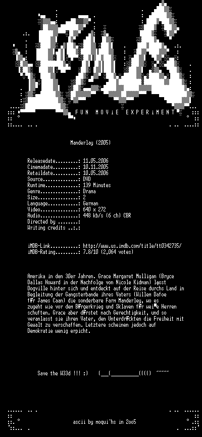 | FiLENAME: | Manderlay.German.2005.AC3.DVDRiP.XviD-FmE.CD2.avi |
