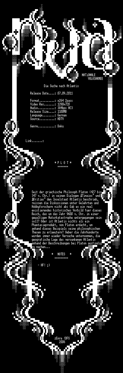 | FiLENAME: | Die.Suche.nach.Atlantis.GERMAN.DOKU.AC3.HDTV.720p.x264-NVA.mkv |
