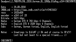 | FiLENAME: | Deadpool.2.THEATRiCAL.2018.German.DL.1080p.BluRay.x264-CHECKMATE.mkv |