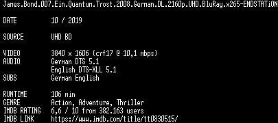 | FiLENAME: | James.Bond.007.Ein.Quantum.Trost.2008.German.DL.2160p.UHD.BluRay.x265-ENDSTATiON.mkv |