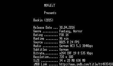| FiLENAME: | Baskin.German.2015.AC3.BDRip.x264-MOViEiT.mkv |
