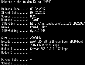 | FiLENAME: | Babette.zieht.in.den.Krieg.German.1959.AC3.BDRip.x264-SPiCY.mkv |