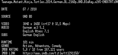 | FiLENAME: | Teenage.Mutant.Ninja.Turtles.2014.German.DL.2160p.UHD.BluRay.x265-ENDSTATiON.mkv |