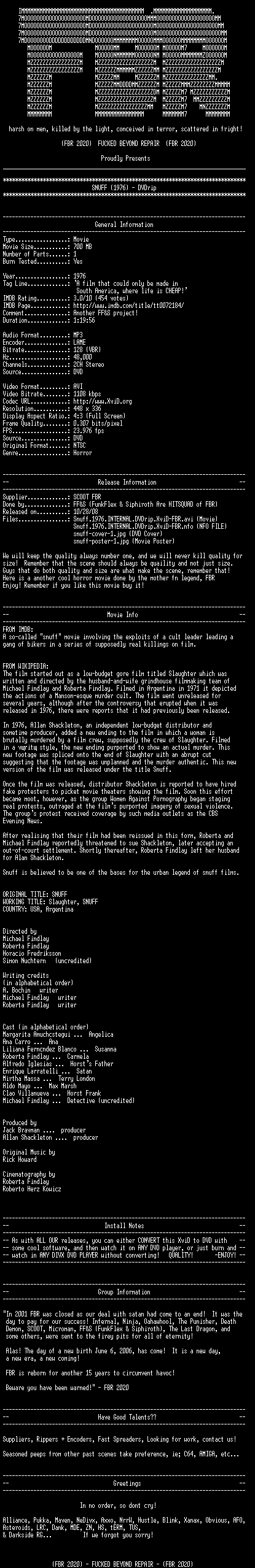 | FiLENAME: | Snuff.1976.INTERNAL.DVDrip.XviD-FBR.avi |