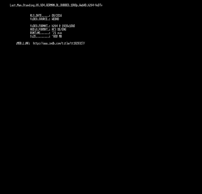 | FiLENAME: | Last.Man.Standing.US.S04E19.GERMAN.DL.DUBBED.1080p.WebHD.h264-VoDTv.mkv |