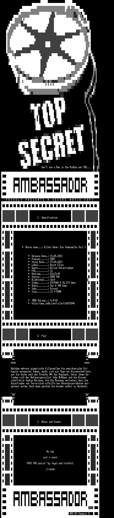 | FiLENAME: | Killer.Wave.Die.Todeswelle.Teil.1.German.2007.DVDRiP.XViD-AMBASSADOR.avi |