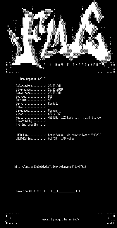 | FiLENAME: | Bon.Appetit.German.2010.DVDRiP.XviD-FmE.avi |