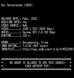 | FiLENAME: | Das.Versprechen.2016.German.720p.WebHD.x264-SLG.mkv |