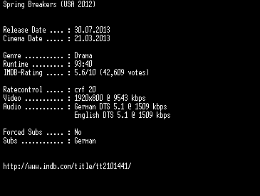 | FiLENAME: | Spring.Breakers.2012.German.DL.1080p.BluRay.x264-EXQUiSiTE.mkv |