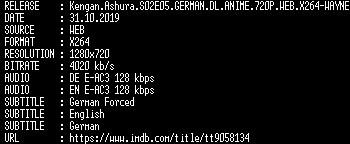 | FiLENAME: | Kengan.Ashura.S02E05.GERMAN.DL.ANIME.720P.WEB.X264-WAYNE.mkv |