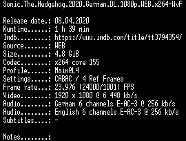 | FiLENAME: | Sonic.The.Hedgehog.2020.German.DL.1080p.WEB.x264-WvF.mkv |