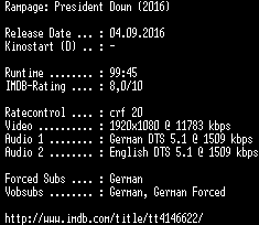 | FiLENAME: | Rampage.President.Down.2016.German.DTS.DL.1080p.BluRay.x264-COiNCiDENCE.mkv |