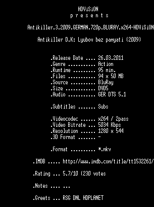 | FiLENAME: | Antikiller.3.2009.GERMAN.720p.BLURAY.x264-HDViSiON.mkv |