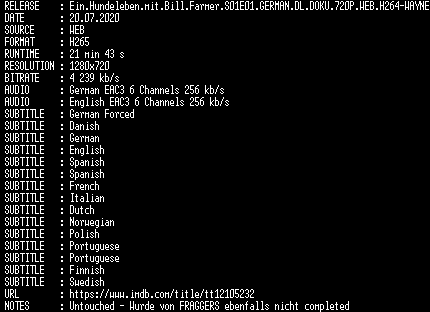 | FiLENAME: | Ein.Hundeleben.mit.Bill.Farmer.S01E01.GERMAN.DL.DOKU.720P.WEB.H264-WAYNE.mkv |