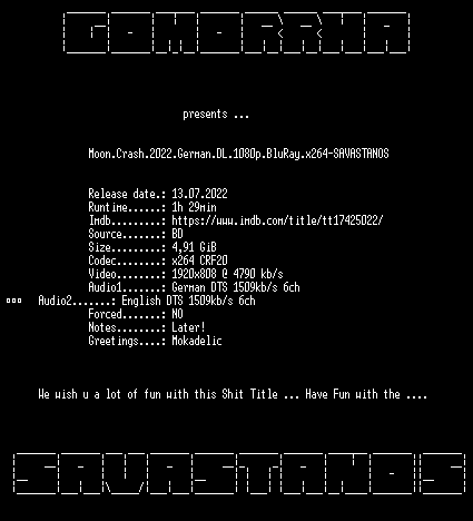 | FiLENAME: | Moon.Crash.2022.German.DL.1080p.BluRay.x264-SAVASTANOS.mkv |