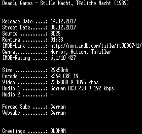 | FiLENAME: | Deadly.Games.Stille.Nacht.Toedliche.Nacht.German.REMASTERED.1989.AC3.BDRip.x264-SPiCY.mkv |