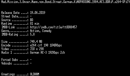 | FiLENAME: | Mad.Mission.3.Unser.Mann.von.Bond.Street.German.KiNOFASSUNG.1984.AC3.BDRiP.x264-SPiCY.mkv |
