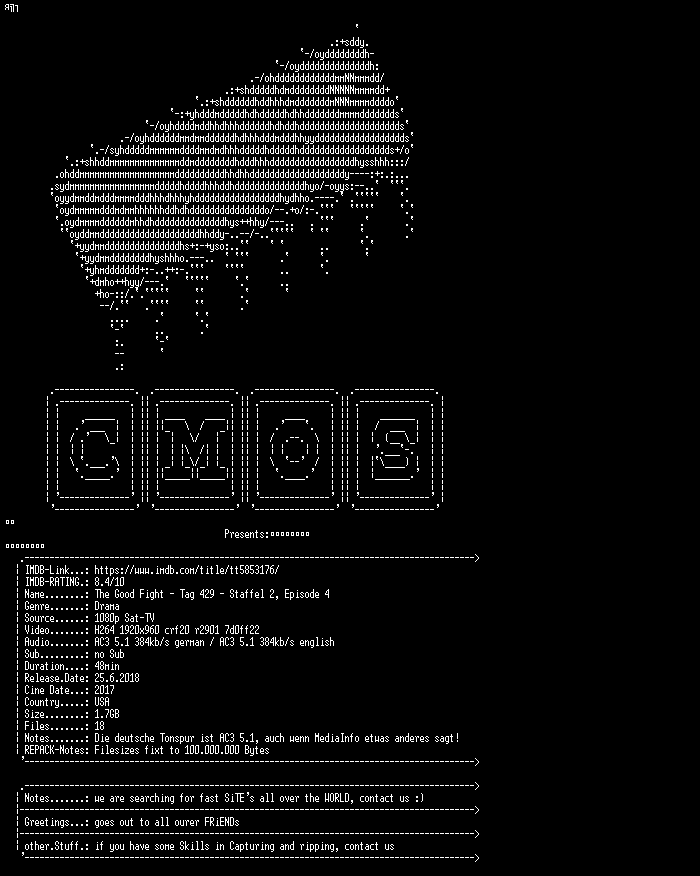 | FiLENAME: | The.Good.Fight.S02E04.Tag.429.GERMAN.DL.1080p.HDTV.x264.REPACK-CMOS.mkv |