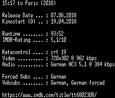 | FiLENAME: | 15.17.to.Paris.German.2018.AC3.BDRip.x264-COiNCiDENCE.mkv |