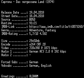 | FiLENAME: | Caprona.Das.vergessene.Land.German.REMASTERED.1974.AC3.BDRip.x264-SPiCY.mkv |