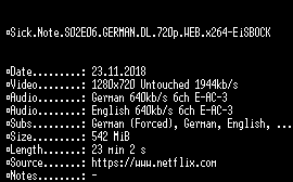| FiLENAME: | Sick.Note.S02E06.GERMAN.DL.720p.WEB.x264-EiSBOCK.mkv |