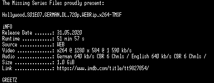 | FiLENAME: | Hollywood.S01E07.GERMAN.DL.720p.WEBRip.x264-TMSF.mkv |
