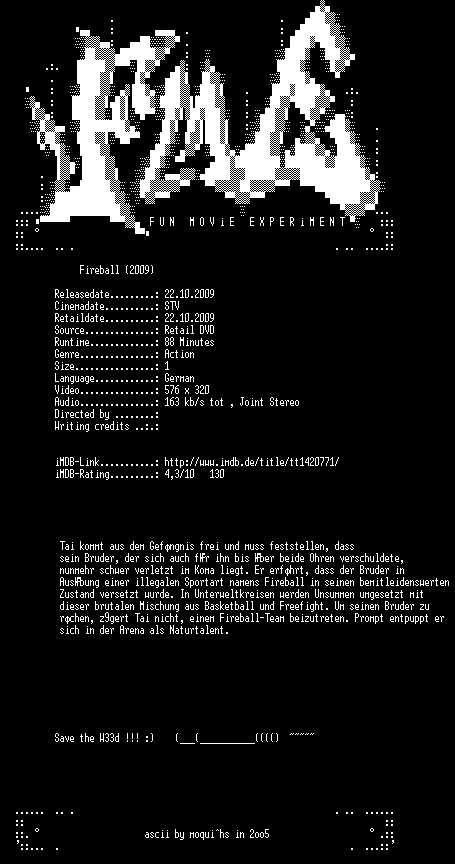 | FiLENAME: | Fireball (2009) [GER WS DVD].avi |