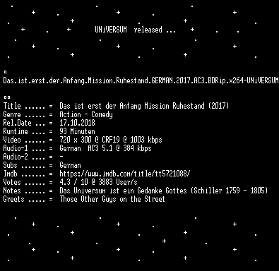 | FiLENAME: | Das.ist.erst.der.Anfang.Mission.Ruhestand.GERMAN.2017.AC3.BDRip.x264-UNiVERSUM.mkv |