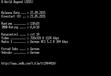 | FiLENAME: | A.World.Beyond.German.2015.AC3.BDRiP.x264-EXQUiSiTE.mkv |