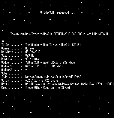 | FiLENAME: | The.Axiom.Tor.zur.Hoelle.GERMAN.2018.AC3.BDRip.x264-UNiVERSUM.mkv |
