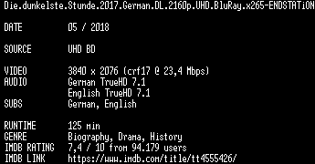 | FiLENAME: | Die.dunkelste.Stunde.2017.German.DL.2160p.UHD.BluRay.x265-ENDSTATiON.mkv |
