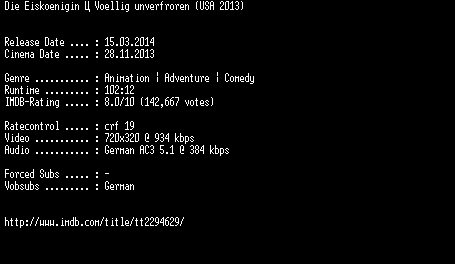 | FiLENAME: | Die.Eiskoenigin.Voellig.unverfroren.German.BDRiP.x264-EXQUiSiTE.mkv |