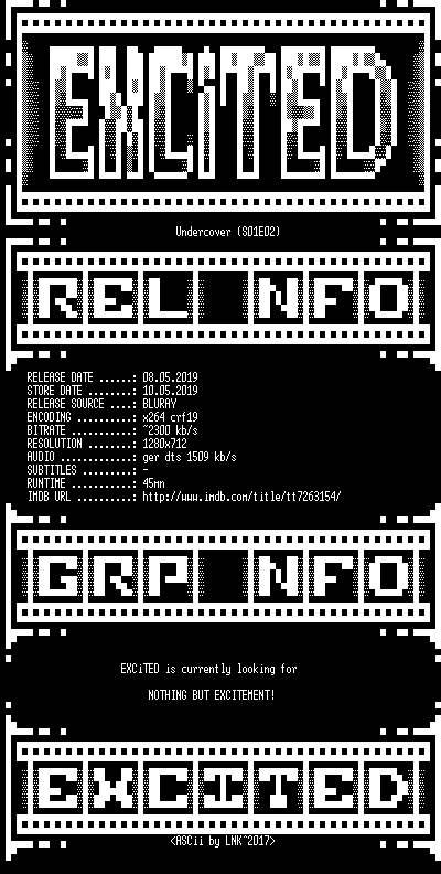 | FiLENAME: | Undercover.2019.S01E02.German.720p.BluRay.x264-EXCiTED.mkv |