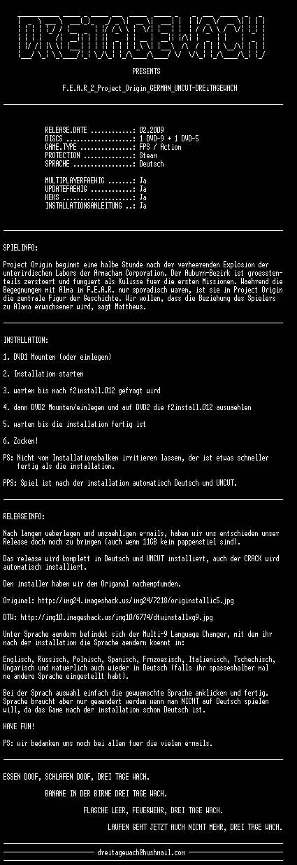 | FiLENAME: | FEAR 2 - Project Origin GERMAN UNCUT DVD1-DREiTAGEWACH.iso |