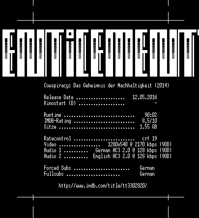 | FiLENAME: | Cowspiracy.Das.Geheimnis.der.Nachhaltigkeit.2014.German.DL.DOKU.720p.WebHD.x264-ENTiCEMENT.mkv |