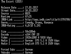 | FiLENAME: | The.Escort.Sex.sells.2015.German.DL.1080p.BluRay.x264-SPiCY.mkv |
