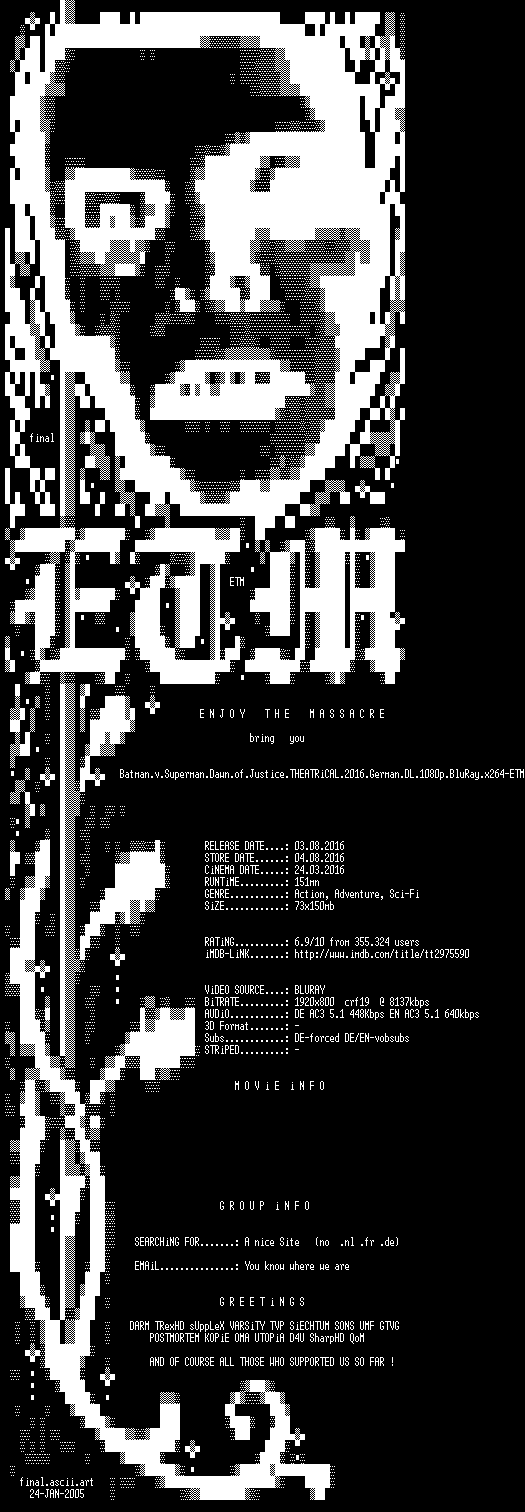 | FiLENAME: | Batman.v.Superman.Dawn.of.Justice.THEATRiCAL.2016.German.DL.1080p.BluRay.x264-ETM.mkv |