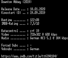 | FiLENAME: | Downton.Abbey.German.2019.AC3.BDRip.x264-COiNCiDENCE.mkv |