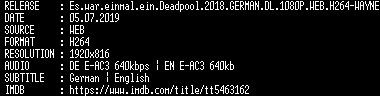 | FiLENAME: | Es.war.einmal.ein.Deadpool.2018.GERMAN.DL.1080P.WEB.H264-WAYNE.mkv |