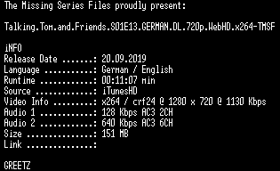 | FiLENAME: | Talking.Tom.and.Friends.S01E13.GERMAN.DL.720p.WebHD.x264-TMSF.mkv |