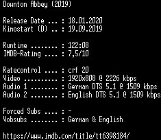 | FiLENAME: | Downton.Abbey.2019.German.DTS.DL.1080p.BluRay.x264-COiNCiDENCE.mkv |