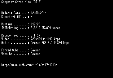 | FiLENAME: | Gangster.Chronicles.German.2013.BDRiP.x264-EXQUiSiTE.mkv |