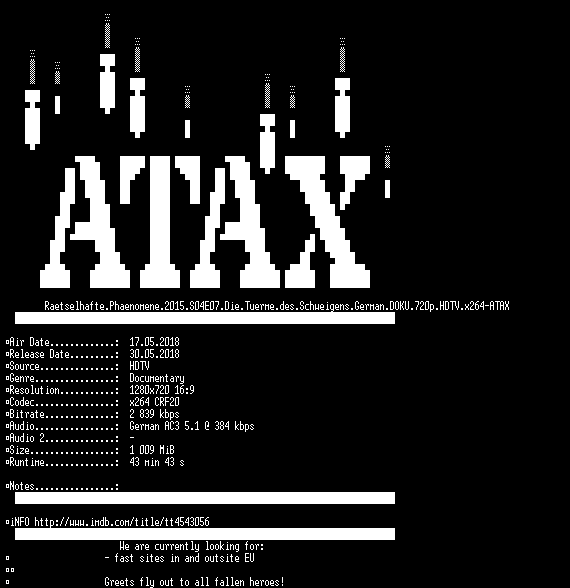 | FiLENAME: | Raetselhafte.Phaenomene.2015.S04E07.Die.Tuerme.des.Schweigens.German.DOKU.720p.HDTV.x264-ATAX.mkv |