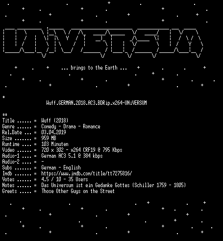 | FiLENAME: | Wuff.GERMAN.2018.AC3.BDRip.x264-UNiVERSUM.mkv |