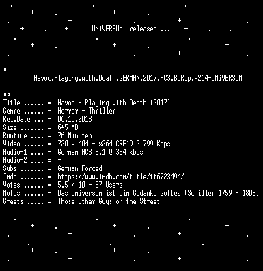 | FiLENAME: | Havoc.Playing.with.Death.GERMAN.2017.AC3.BDRip.x264-UNiVERSUM.mkv |
