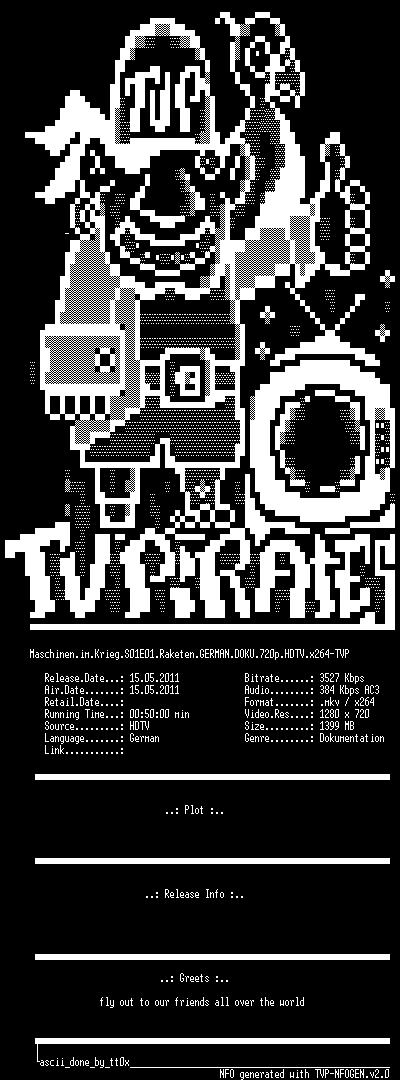 | FiLENAME: | Maschinen.im.Krieg.S01E01.Raketen.GERMAN.DOKU.720p.HDTV.x264-TVP.mkv |