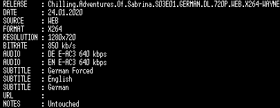 | FiLENAME: | Chilling.Adventures.Of.Sabrina.S03E01.GERMAN.DL.720P.WEB.X264-WAYNE.mkv |