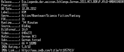 | FiLENAME: | Die.Legende.der.weissen.Schlange.German.2011.AC3.BDRiP.XViD-AMBASSADOR.avi |