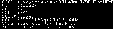 | FiLENAME: | Harvey.Miezen.fuer.immer.S02E11.GERMAN.DL.720P.WEB.X264-WAYNE.mkv |
