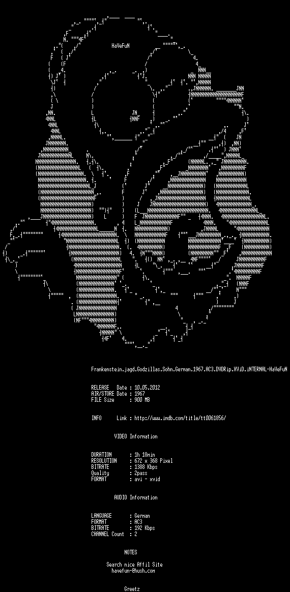 | FiLENAME: | Frankenstein.jagd.Godzillas.Sohn.German.1967.AC3.DVDRip.XViD.iNTERNAL-HaVeFuN.avi |
